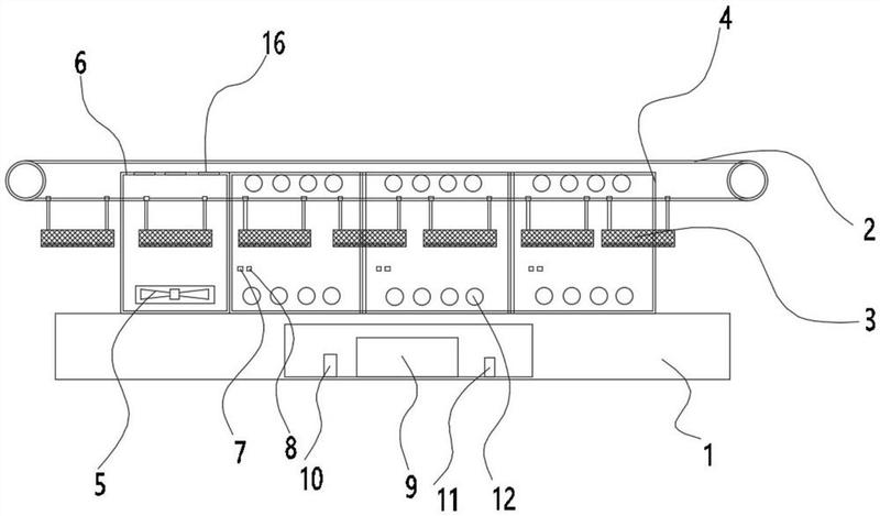 一种金属片材的梯度变温烘干装置本实用新型公开了一种金属片材的梯度变温烘干装置,包括机台,所述的机台的
